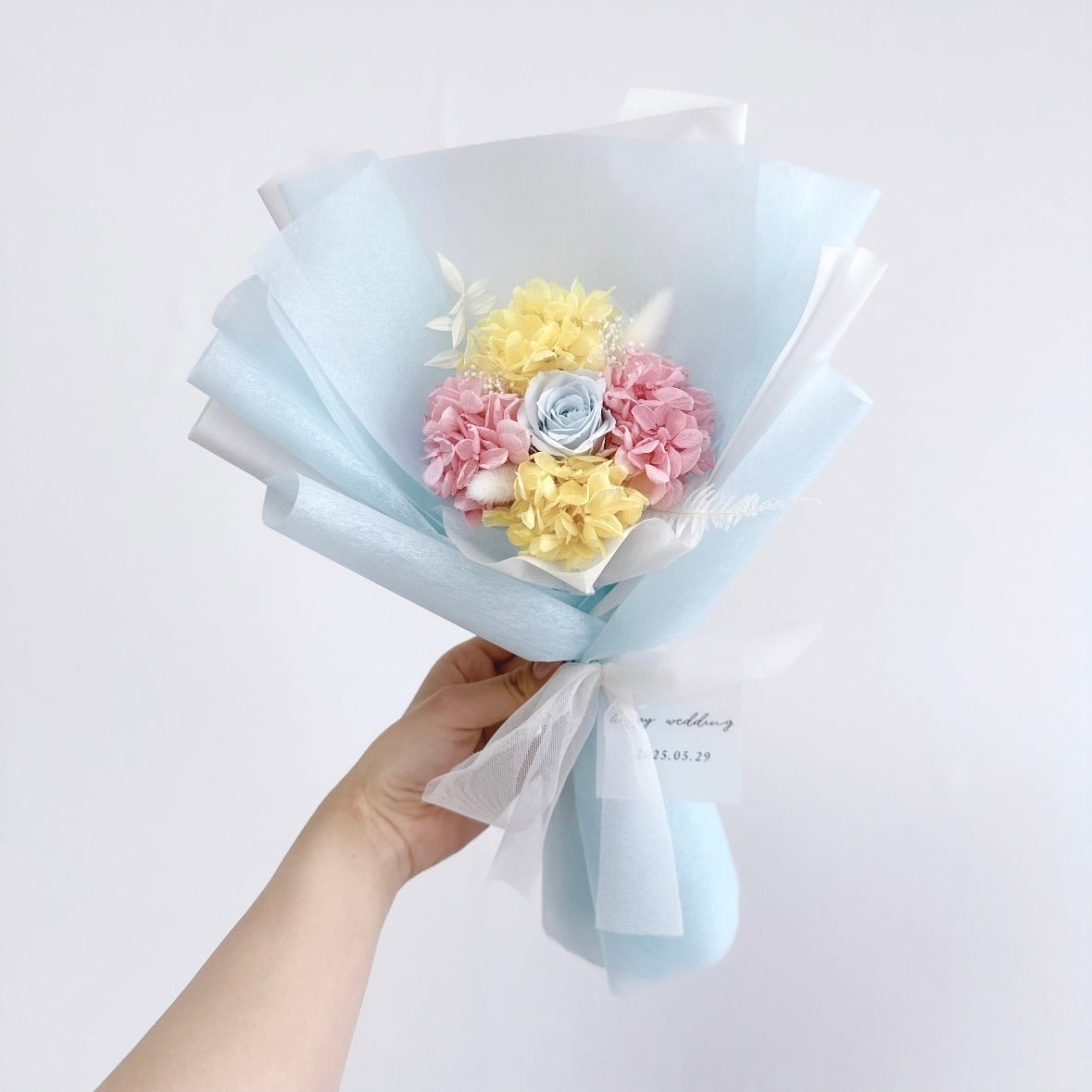 ベビーブルー、イエロー、ホワイトのアジサイの量を少し減らして