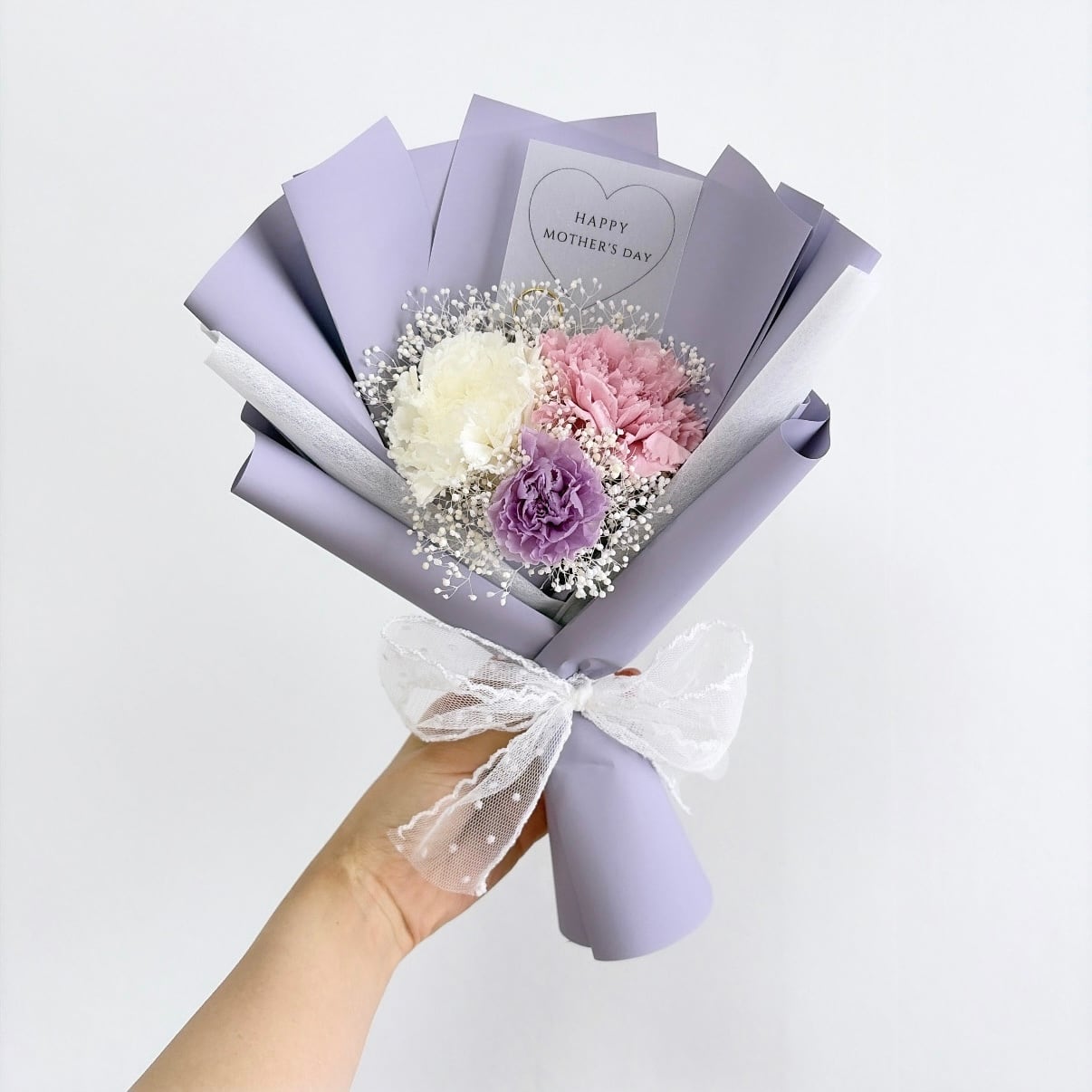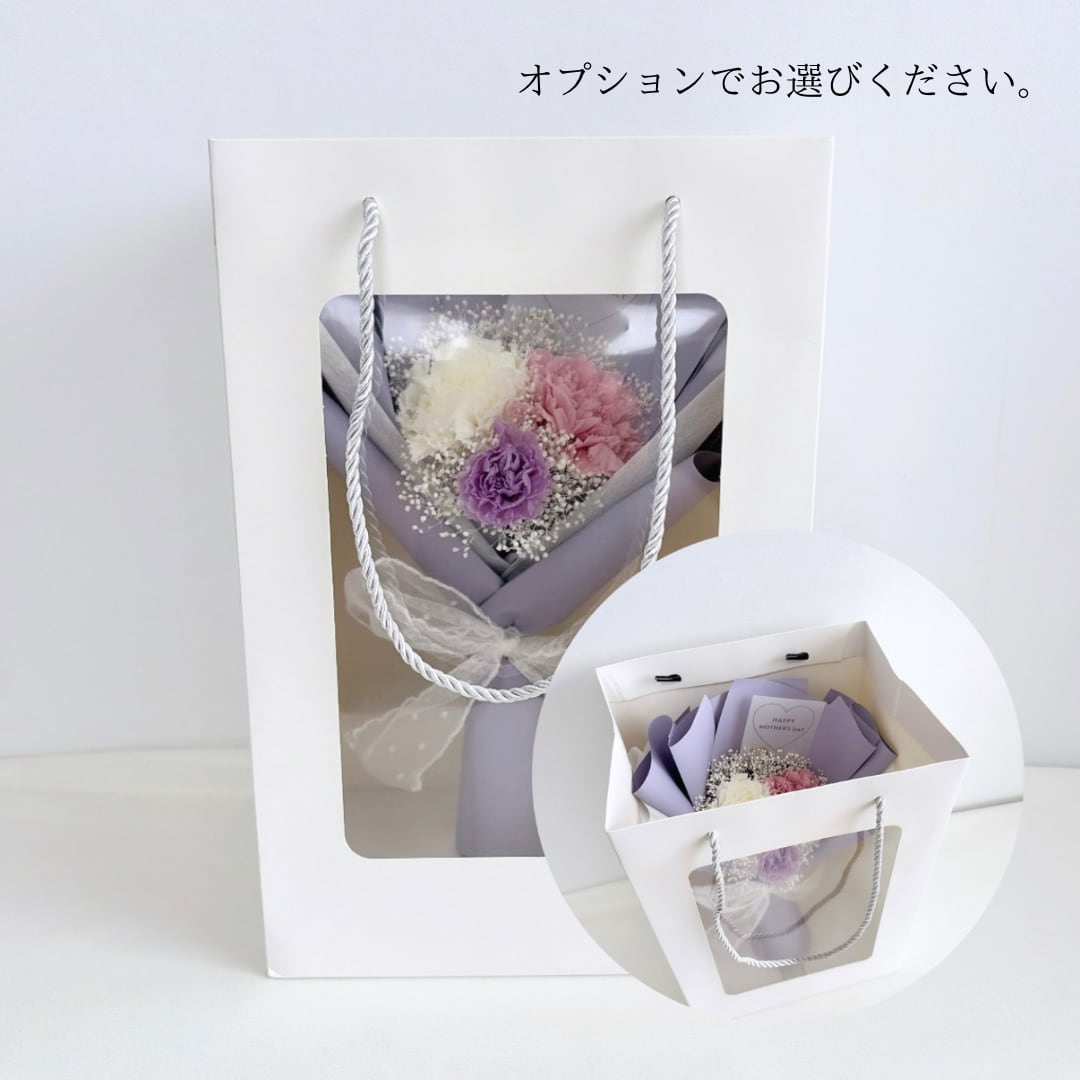 プリザーブドフラワーのカーネーションとかすみ草の花束。